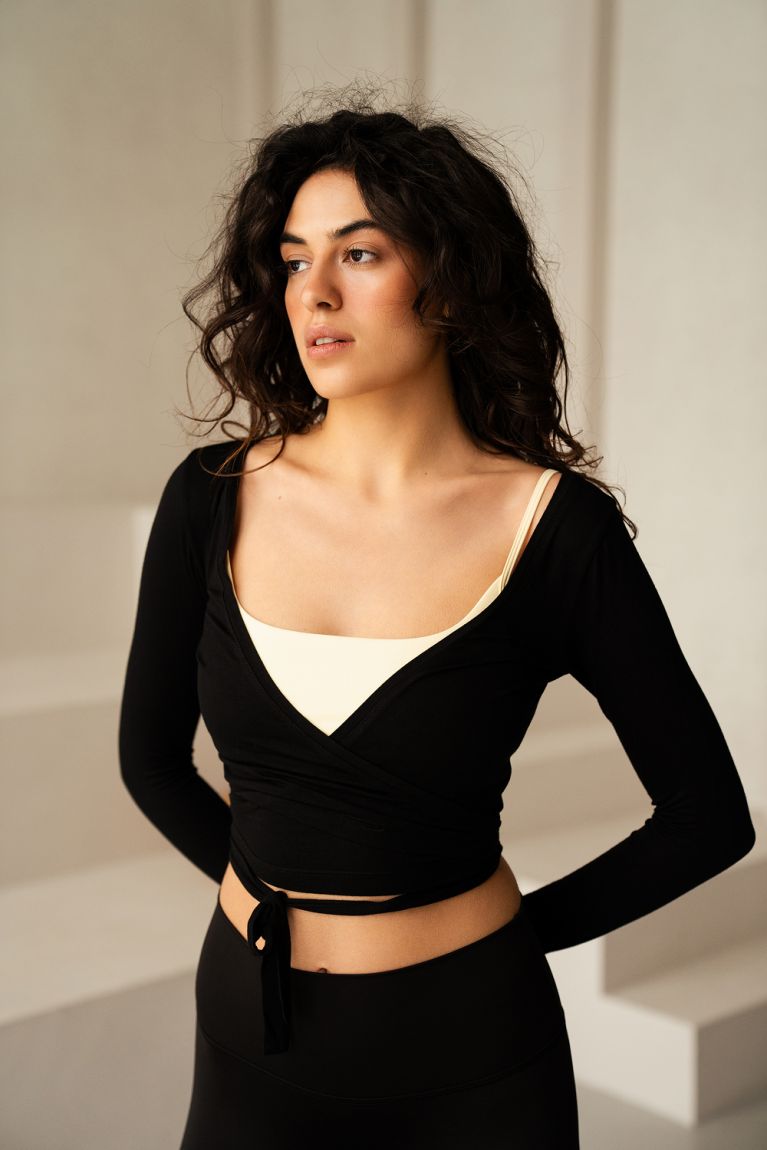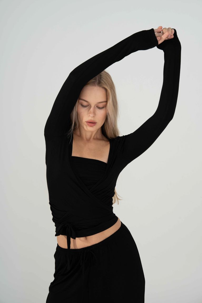 Жіночна кофта на запах, де ти сама регулюєш комфортну посадку. Універсальна річ: стильно виглядає як зі спортивними легінсами, так і зі струмливими штанами з віскози.